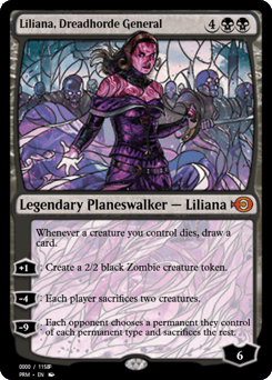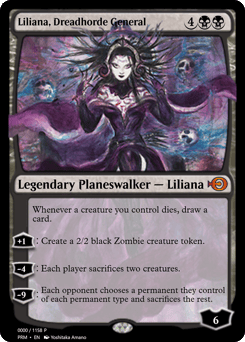 Whenever a creature you control dies, draw a card. [+1]: Create a 2/2 black Zombie creature token. [−4]: Each player sacrifices two creatures of their choice. [−9]: Each opponent chooses a permanent they control of each permanent type and sacrifices the rest.