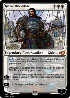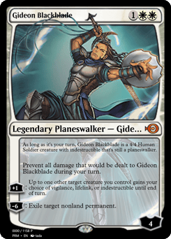 During your turn, Gideon Blackblade is a 4/4 Human Soldier creature with indestructible that's still a planeswalker. Prevent all damage that would be dealt to Gideon Blackblade during your turn. [+1]: Up to one other target creature you control gains your choice of vigilance, lifelink, or indestructible until end of turn. [−6]: Exile target nonland permanent.
