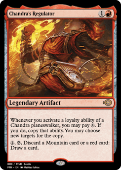 Whenever you activate a loyalty ability of a Chandra planeswalker, you may pay {1}. If you do, copy that ability. You may choose new targets for the copy. {1}, {T}, Discard a Mountain card or a red card: Draw a card.