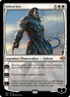 [+2]: During target opponent's next turn, creatures that player controls attack Gideon Jura if able. [−2]: Destroy target tapped creature. [0]: Until end of turn, Gideon Jura becomes a 6/6 Human Soldier creature that's still a planeswalker. Prevent all damage that would be dealt to him this turn.