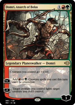 Creatures you control get +1/+0. [+1]: Add {R} or {G}. Creature spells you cast this turn can't be countered. [−2]: Target creature you control fights target creature you don't control.