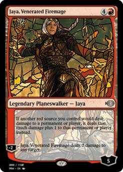 If another red source you control would deal damage to a permanent or player, it deals that much damage plus 1 to that permanent or player instead. [−2]: Jaya deals 2 damage to any target.