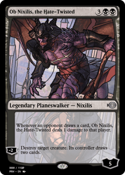 Whenever an opponent draws a card, Ob Nixilis deals 1 damage to that player. [−2]: Destroy target creature. Its controller draws two cards.