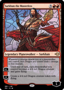 Whenever a creature attacks you or a planeswalker you control, each Dragon you control deals 1 damage to that creature. [+1]: Until end of turn, each planeswalker you control becomes a 4/4 red Dragon creature and gains flying. [−3]: Create a 4/4 red Dragon creature token with flying.
