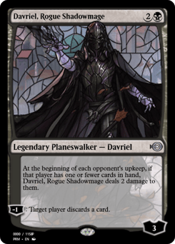 At the beginning of each opponent's upkeep, if that player has one or fewer cards in hand, Davriel deals 2 damage to them. [−1]: Target player discards a card.