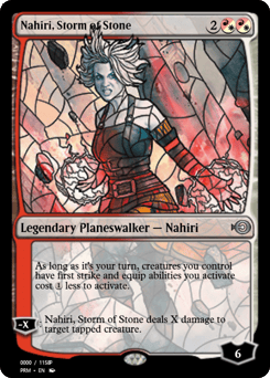 During your turn, creatures you control have first strike and equip abilities you activate cost {1} less to activate. [−X]: Nahiri deals X damage to target tapped creature.