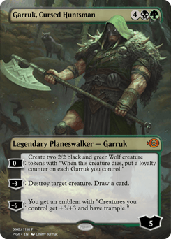 [0]: Create two 2/2 black and green Wolf creature tokens with "When this token dies, put a loyalty counter on each Garruk you control." [−3]: Destroy target creature. Draw a card. [−6]: You get an emblem with "Creatures you control get +3/+3 and have trample."