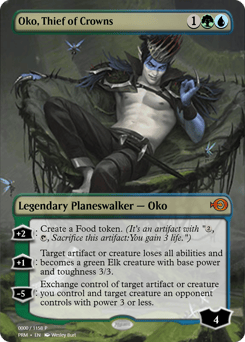 [+2]: Create a Food token. (It's an artifact with "{2}, {T}, Sacrifice this token: You gain 3 life.") [+1]: Target artifact or creature loses all abilities and becomes a green Elk creature with base power and toughness 3/3. [−5]: Exchange control of target artifact or creature you control and target creature an opponent controls with power 3 or less.