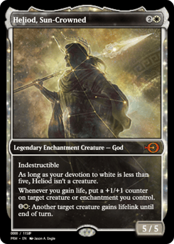 Indestructible As long as your devotion to white is less than five, Heliod isn't a creature. Whenever you gain life, put a +1/+1 counter on target creature or enchantment you control. {1}{W}: Another target creature gains lifelink until end of turn.