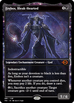 Indestructible As long as your devotion to black is less than five, Erebos isn't a creature. Whenever another creature you control dies, you may pay 2 life. If you do, draw a card. {1}{B}, Sacrifice another creature: Target creature gets -2/-1 until end of turn.