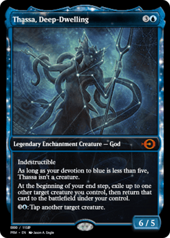 Indestructible As long as your devotion to blue is less than five, Thassa isn't a creature. At the beginning of your end step, exile up to one other target creature you control, then return that card to the battlefield under your control. {3}{U}: Tap another target creature.
