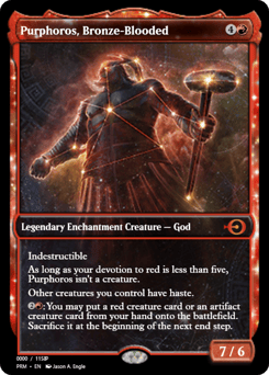 Indestructible As long as your devotion to red is less than five, Purphoros isn't a creature. Other creatures you control have haste. {2}{R}: You may put a red creature card or an artifact creature card from your hand onto the battlefield. Sacrifice it at the beginning of the next end step.