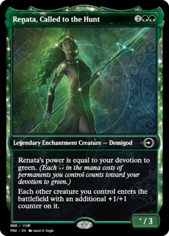 Renata's power is equal to your devotion to green. (Each {G} in the mana costs of permanents you control counts toward your devotion to green.) Each other creature you control enters with an additional +1/+1 counter on it.