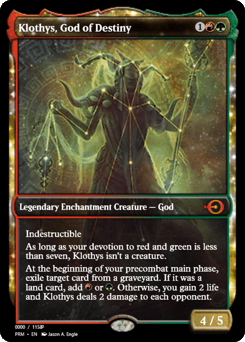 Indestructible As long as your devotion to red and green is less than seven, Klothys isn't a creature. At the beginning of your first main phase, exile target card from a graveyard. If it was a land card, add {R} or {G}. Otherwise, you gain 2 life and Klothys deals 2 damage to each opponent.