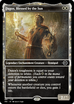 Daxos's toughness is equal to your devotion to white. (Each {W} in the mana costs of permanents you control counts toward your devotion to white.) Whenever another creature you control enters or dies, you gain 1 life.