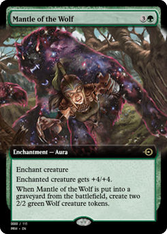 Enchant creature Enchanted creature gets +4/+4. When this Aura is put into a graveyard from the battlefield, create two 2/2 green Wolf creature tokens.