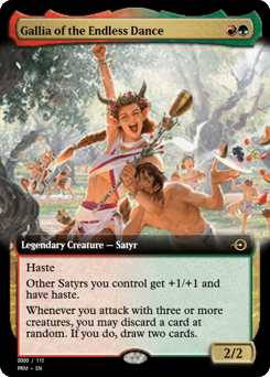 Haste Other Satyrs you control get +1/+1 and have haste. Whenever you attack with three or more creatures, you may discard a card at random. If you do, draw two cards.