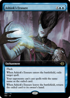 Flash When this enchantment enters, exile target spell. Your opponents can't cast spells with the same name as the exiled card. When this enchantment leaves the battlefield, return the exiled card to its owner's hand.