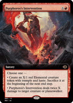 Choose one — • Create an X/1 red Elemental creature token with trample and haste. Sacrifice it at the beginning of the next end step. • Purphoros's Intervention deals twice X damage to target creature or planeswalker.
