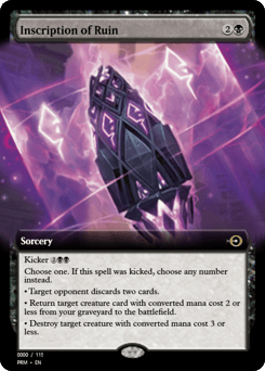 Kicker {2}{B}{B} Choose one. If this spell was kicked, choose any number instead. • Target opponent discards two cards. • Return target creature card with mana value 2 or less from your graveyard to the battlefield. • Destroy target creature with mana value 3 or less.