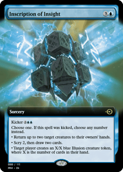 Kicker {2}{U}{U} Choose one. If this spell was kicked, choose any number instead. • Return up to two target creatures to their owners' hands. • Scry 2, then draw two cards. • Target player creates an X/X blue Illusion creature token, where X is the number of cards in their hand.