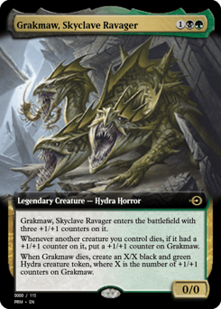 Grakmaw enters with three +1/+1 counters on it. Whenever another creature you control dies, if it had a +1/+1 counter on it, put a +1/+1 counter on Grakmaw. When Grakmaw dies, create an X/X black and green Hydra creature token, where X is the number of +1/+1 counters on Grakmaw.