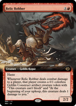 Haste Whenever this creature deals combat damage to a player, that player creates a 0/1 colorless Goblin Construct artifact creature token with "This token can't block" and "At the beginning of your upkeep, this token deals 1 damage to you."