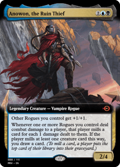 Other Rogues you control get +1/+1. Whenever one or more Rogues you control deal combat damage to a player, that player mills a card for each 1 damage dealt to them. If the player mills at least one creature card this way, you draw a card. (To mill a card, a player puts the top card of their library into their graveyard.)