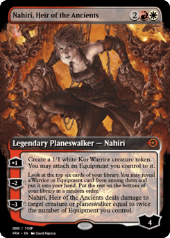[+1]: Create a 1/1 white Kor Warrior creature token. You may attach an Equipment you control to it. [−2]: Look at the top six cards of your library. You may reveal a Warrior or Equipment card from among them and put it into your hand. Put the rest on the bottom of your library in a random order. [−3]: Nahiri deals damage to target creature or planeswalker equal to twice the number of Equipment you control.