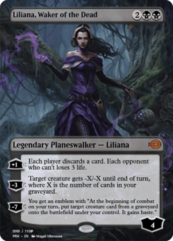 [+1]: Each player discards a card. Each opponent who can't loses 3 life. [−3]: Target creature gets -X/-X until end of turn, where X is the number of cards in your graveyard. [−7]: You get an emblem with "At the beginning of combat on your turn, put target creature card from a graveyard onto the battlefield under your control. It gains haste."