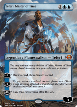 You may activate loyalty abilities of Teferi on any player's turn any time you could cast an instant. [+1]: Draw a card, then discard a card. [−3]: Target creature you don't control phases out. (Treat it and anything attached to it as though they don't exist until its controller's next turn.) [−10]: Take two extra turns after this one.