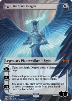[+2]: Ugin deals 3 damage to any target. [−X]: Exile each permanent with mana value X or less that's one or more colors. [−10]: You gain 7 life, draw seven cards, then put up to seven permanent cards from your hand onto the battlefield.
