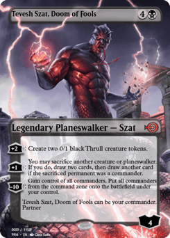 [+2]: Create two 0/1 black Thrull creature tokens. [+1]: You may sacrifice another creature or planeswalker. If you do, draw two cards, then draw another card if the sacrificed permanent was a commander. [−10]: Gain control of all commanders. Put all commanders from the command zone onto the battlefield under your control. Tevesh Szat, Doom of Fools can be your commander. Partner