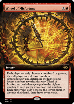 Each player secretly chooses a number 0 or greater, then all players reveal those numbers simultaneously and determine the highest and lowest numbers revealed this way. Wheel of Misfortune deals damage equal to the highest number to each player who chose that number. Each player who didn't choose the lowest number discards their hand, then draws seven cards.