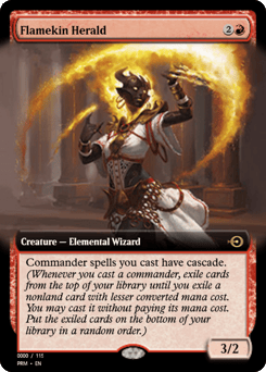 Commander spells you cast have cascade. (Whenever you cast a commander, exile cards from the top of your library until you exile a nonland card with lesser mana value. You may cast it without paying its mana cost. Put the exiled cards on the bottom in a random order.)