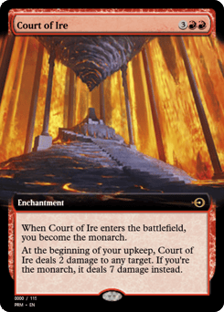 When this enchantment enters, you become the monarch. At the beginning of your upkeep, this enchantment deals 2 damage to any target. If you're the monarch, it deals 7 damage instead.