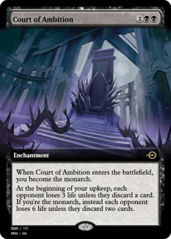 When this enchantment enters, you become the monarch. At the beginning of your upkeep, each opponent loses 3 life unless they discard a card. If you're the monarch, instead each opponent loses 6 life unless they discard two cards.
