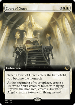 When this enchantment enters, you become the monarch. At the beginning of your upkeep, create a 1/1 white Spirit creature token with flying. If you're the monarch, create a 4/4 white Angel creature token with flying instead.