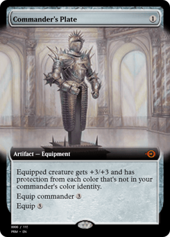 Equipped creature gets +3/+3 and has protection from each color that's not in your commander's color identity. Equip commander {3} Equip {5}
