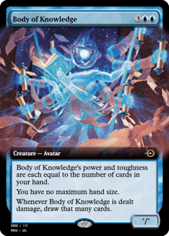 Body of Knowledge's power and toughness are each equal to the number of cards in your hand. You have no maximum hand size. Whenever this creature is dealt damage, draw that many cards.