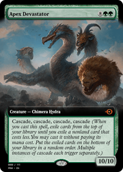 Cascade, cascade, cascade, cascade (When you cast this spell, exile cards from the top of your library until you exile a nonland card that costs less. You may cast it without paying its mana cost. Put the exiled cards on the bottom in a random order. Multiple instances of cascade each trigger separately.)