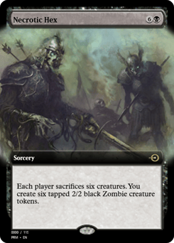 Each player sacrifices six creatures of their choice. You create six tapped 2/2 black Zombie creature tokens.