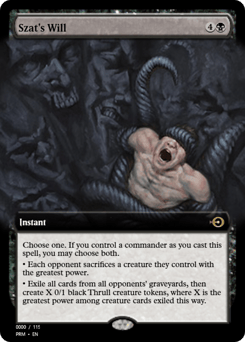 Choose one. If you control a commander as you cast this spell, you may choose both instead. • Each opponent sacrifices a creature they control with the greatest power. • Exile all opponents' graveyards, then create X 0/1 black Thrull creature tokens, where X is the greatest power among creature cards exiled this way.