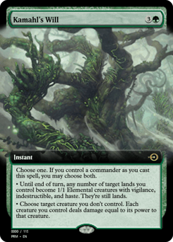 Choose one. If you control a commander as you cast this spell, you may choose both instead. • Until end of turn, any number of target lands you control become 1/1 Elemental creatures with vigilance, indestructible, and haste. They're still lands. • Choose target creature you don't control. Each creature you control deals damage equal to its power to that creature.