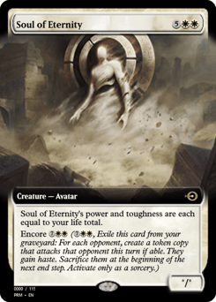 Soul of Eternity's power and toughness are each equal to your life total. Encore {7}{W}{W} ({7}{W}{W}, Exile this card from your graveyard: For each opponent, create a token copy that attacks that opponent this turn if able. They gain haste. Sacrifice them at the beginning of the next end step. Activate only as a sorcery.)