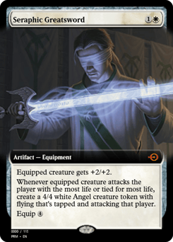 Flying Whenever this creature attacks, look at the top six cards of your library. You may put an Aura or Equipment card from among them onto the battlefield. If an Equipment is put onto the battlefield this way, you may attach it to a creature you control. Put the rest of those cards on the bottom of your library in a random order.