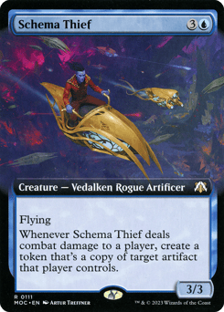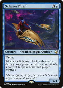 Flying Whenever this creature deals combat damage to a player, create a token that's a copy of target artifact that player controls.