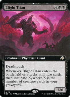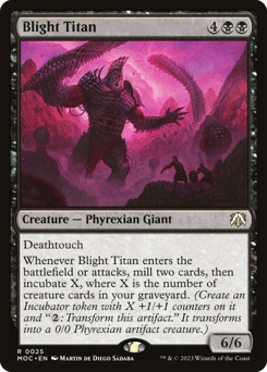 Deathtouch Whenever this creature enters or attacks, mill two cards, then incubate X, where X is the number of creature cards in your graveyard. (Create an Incubator token with X +1/+1 counters on it and "{2}: Transform this token." It transforms into a 0/0 Phyrexian artifact creature.)