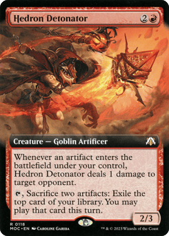 Whenever an artifact you control enters, this creature deals 1 damage to target opponent. {T}, Sacrifice two artifacts: Exile the top card of your library. You may play that card this turn.