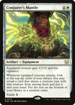 Equipped creature gets +1/+1 and has vigilance. Whenever equipped creature attacks, look at the top six cards of your library. You may reveal a card that shares a creature type with that creature from among them and put it into your hand. Put the rest on the bottom of your library in a random order. Equip {1}